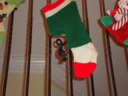 It seems when I wasn’t looking she was stuffing items from all around the house into the stockings. Before you tell me to look there for the napkin rings, I already have.ย They weren’t there. I did find a toothbrush (used) and a flashlight.