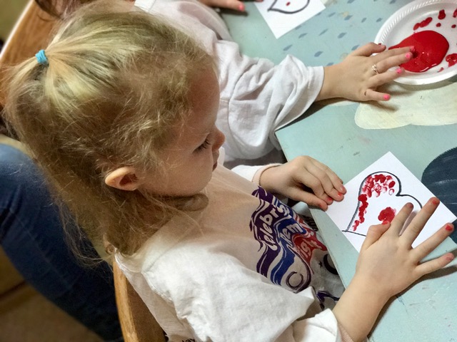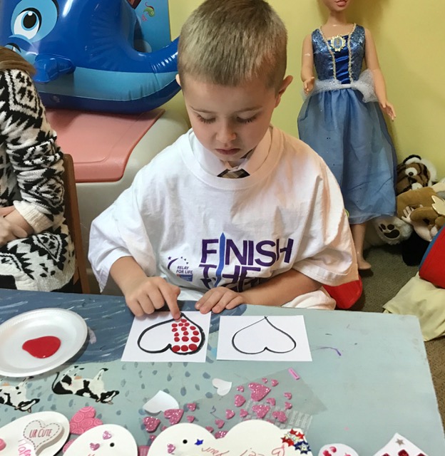 When it came to the actual decorating we gave them several choices. This little guy is finger painting dots on his valentine. Looks like he’s got all his “dots in a row!”
