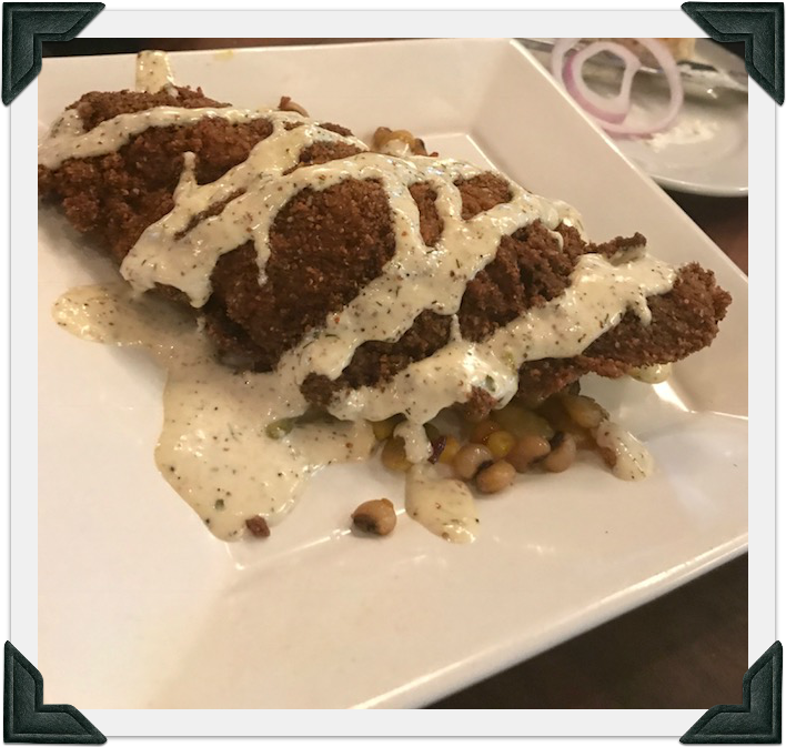 My daughter and I split a dinner. We had pecan encrusted catfish with chutney and a sauce. It was simply delicious and I ate every bite.
