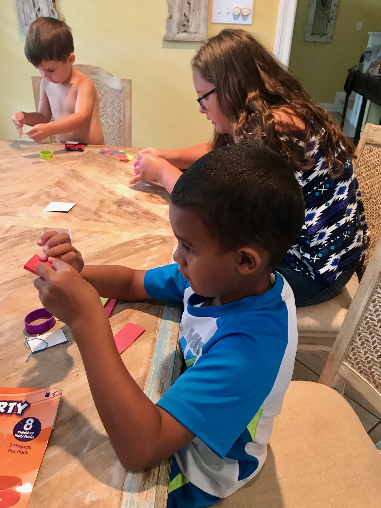 Here they are working on their bracelets and putting the sticky jewels on them. Can you tell how hard they are concentrating? They loved decorating them and managed to decorate a few other things in the house with them as well!