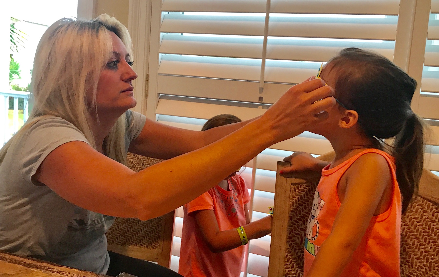 This is my daughter fitting the super hero mask on her niece. This craft was by far the favorite and most popular.
