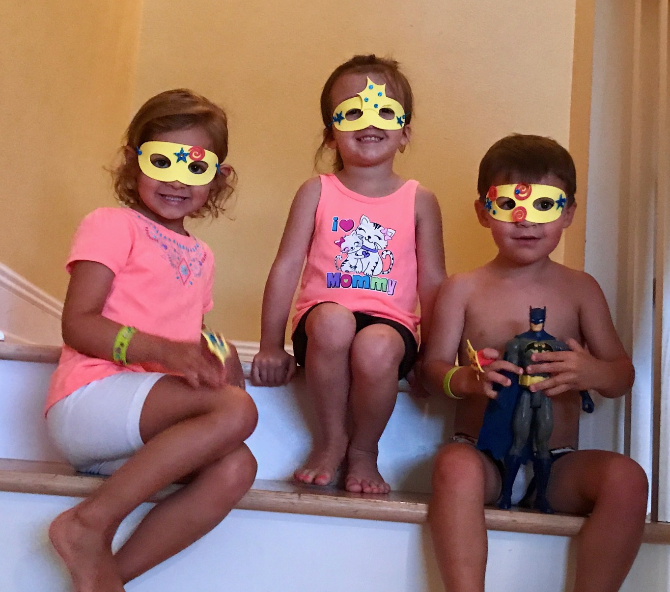 Are these not the cutest little Super Heroes you have ever seen? We went to the movies after this and they insisted on wearing their masks to the theater. I wish I had thought to get material for capes but I didn’t. However if you get this for your grandchild that would be a fun addition!