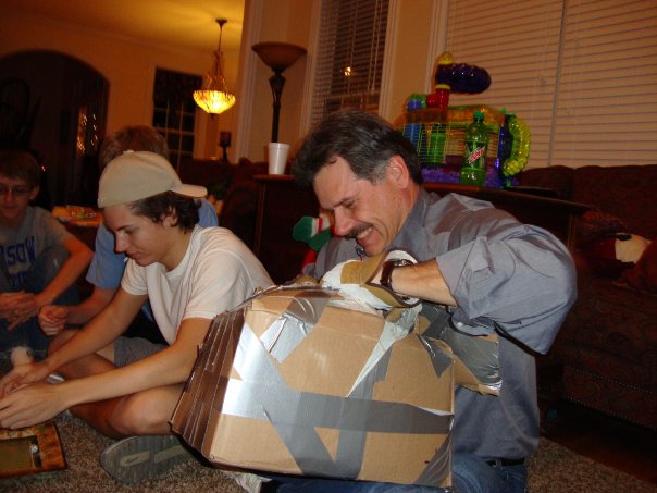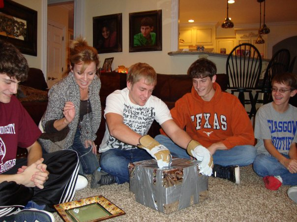 All you have to have to play this game (I have no idea what it’s called) is a pair of dice, a pair of gloves (the fat ones work best) and several boxes and masking tape.ย You put the prize (we used cash) inside a small box and wrapped it with lots of thick, powerful tape.ย Then you wrap that box inside another and repeat the process as often as you want.ย On the outside its wrapped like a Christmas gift (or just gift wrap). One person rolls the dice and if you roll doubles you get to wear the gloves and open the gift, but you only get to work on it until the next person rolls doubles. Then they get the gloves and they get to try to open it. If you roll double sixes you get to take the gloves OFF and give it a go. Needless to say everyone rolls the dice really quickly to try and keep someone else from getting the prize.