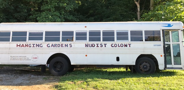 This bus doesn’t look like it’s been moved in awhile so I’m guessing either the nudist colony abandoned it, or someone just painted that on the side to be funny, probably the latter.