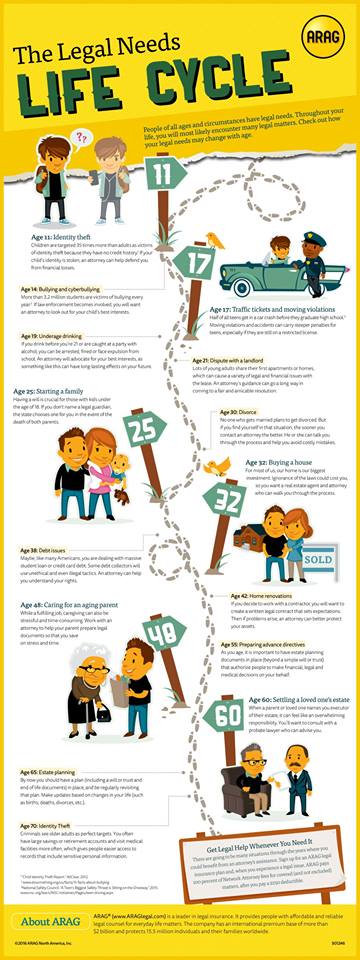 No matter who we are or what our age, there are times when we need legal help. Check out this great infographic to see what you might need at different times in your life. (I provided a link in case this is hard for you to read).