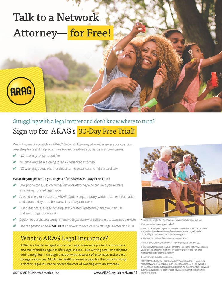 1. One phone call with an ARAG Network Attorney who can help address an existing covered legal issues.