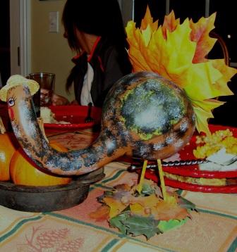 By the way, she’s also a yard sale queen and the two silver dishes on the end were $5 bargains. She likes to decorate too and this turkey (made from a gourd) was on the table where I ate. Isn’t he adorable?