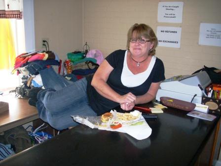 This is Kaye, eating lunch at her consignment store, Everything Under the Sun (great place for bargains!)ย I walked in and she was eating lunch, but it was the WAY she was eating that tickled my funny bone. Oh to be so relaxed! Way to go Kaye, you rock!