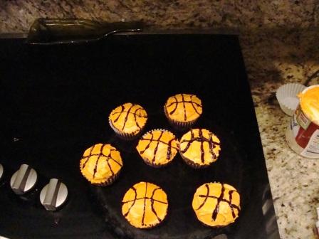 Our boys played their last high school basketball game this week and I made these for the team. I had a hard time with the black icing. My hands shook. The gel stuff either came out in blobs or smeared. Every time I messed up a cupcake (the ones with blobs and smears) I did the only reasonable thing to do….I ate it. Before the night was over I had eaten four. They might not look so good, but I promise they tasted yummy!