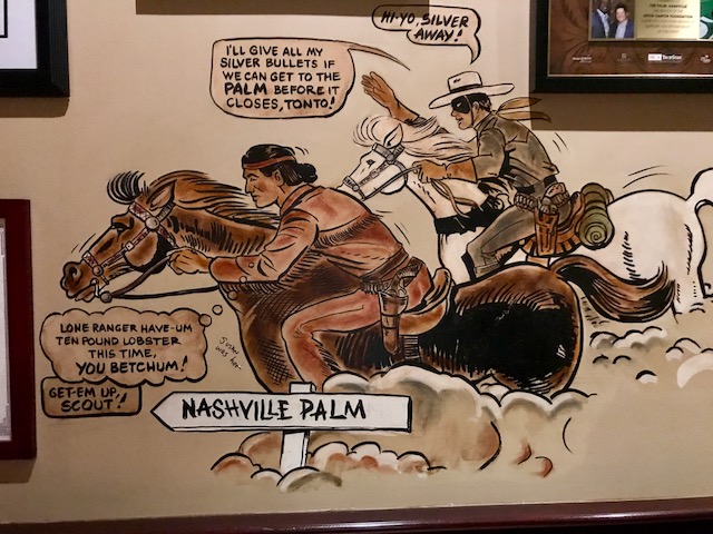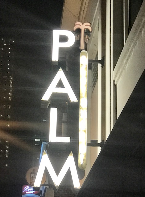 This is on the wall in the Palm Restaurant, close to the Ladies’ Room. While I was looking at this and making pictures a young man went in the women’s room. I stood there wondering and watching. Within a few seconds he came bursting out exclaiming, “There’s no urinals in there!”