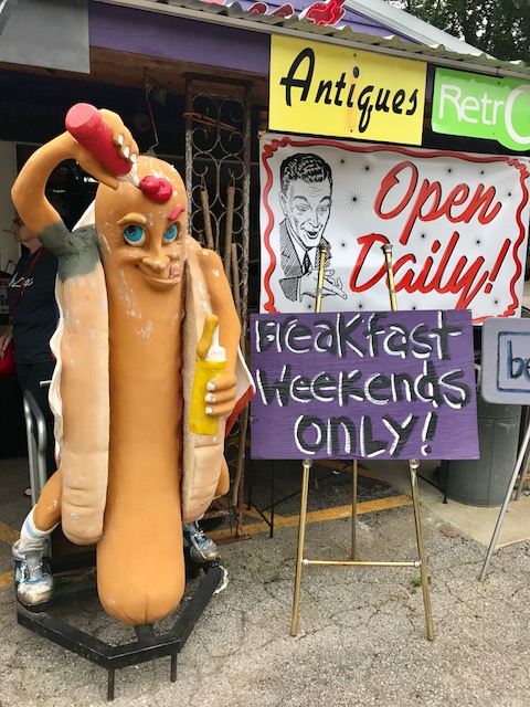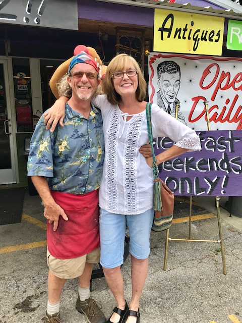 I didn’t realize it but John was actually at the store cooking hot dogs. My friend Peggy was with me and we bought a hotdog. Before we left I had my picture made with John. Notice the Antiques sign to the right of my head… it looks like it was put there for John and I to have our picture made under!