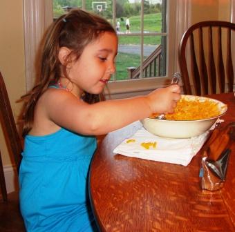 So after we played awhile we had a delicious supper of two different kinds of grilled meat, grilled veggies, salad, corn, bread and Abby’s favorite, macaroni and cheese. After everyone left the table she asked if she could have some more and I said sure. She grabbed the bowl and ate straight from the bowl.