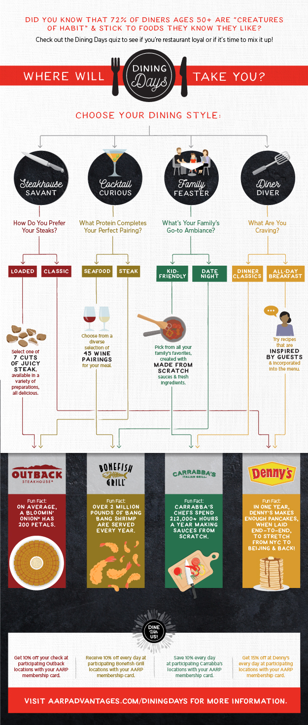 Want to try somewhere new but donโt know where to start? AARP Member Advantages can also help find the restaurant best fit for your next dining experience. See the decision tree below and see where it takes you.