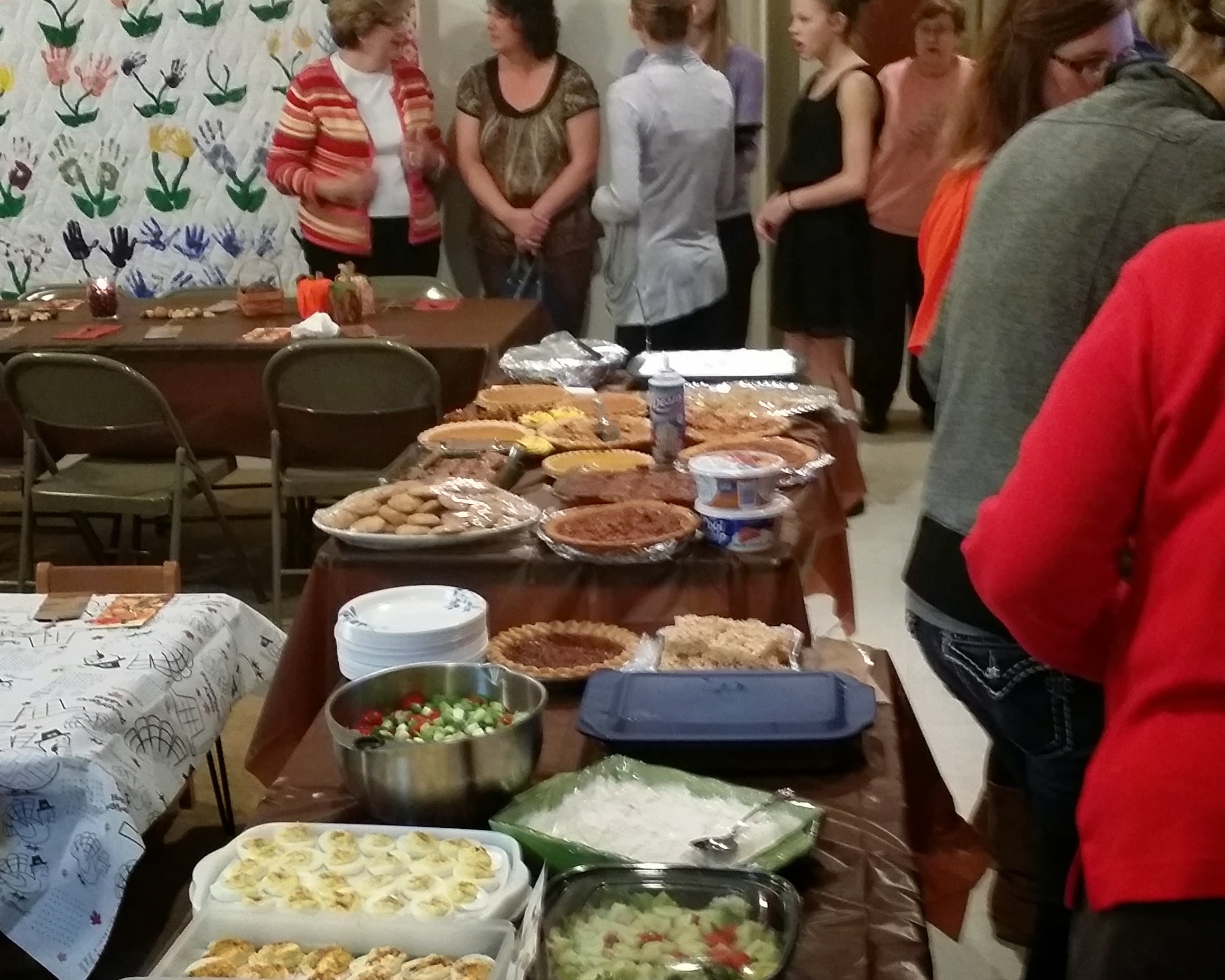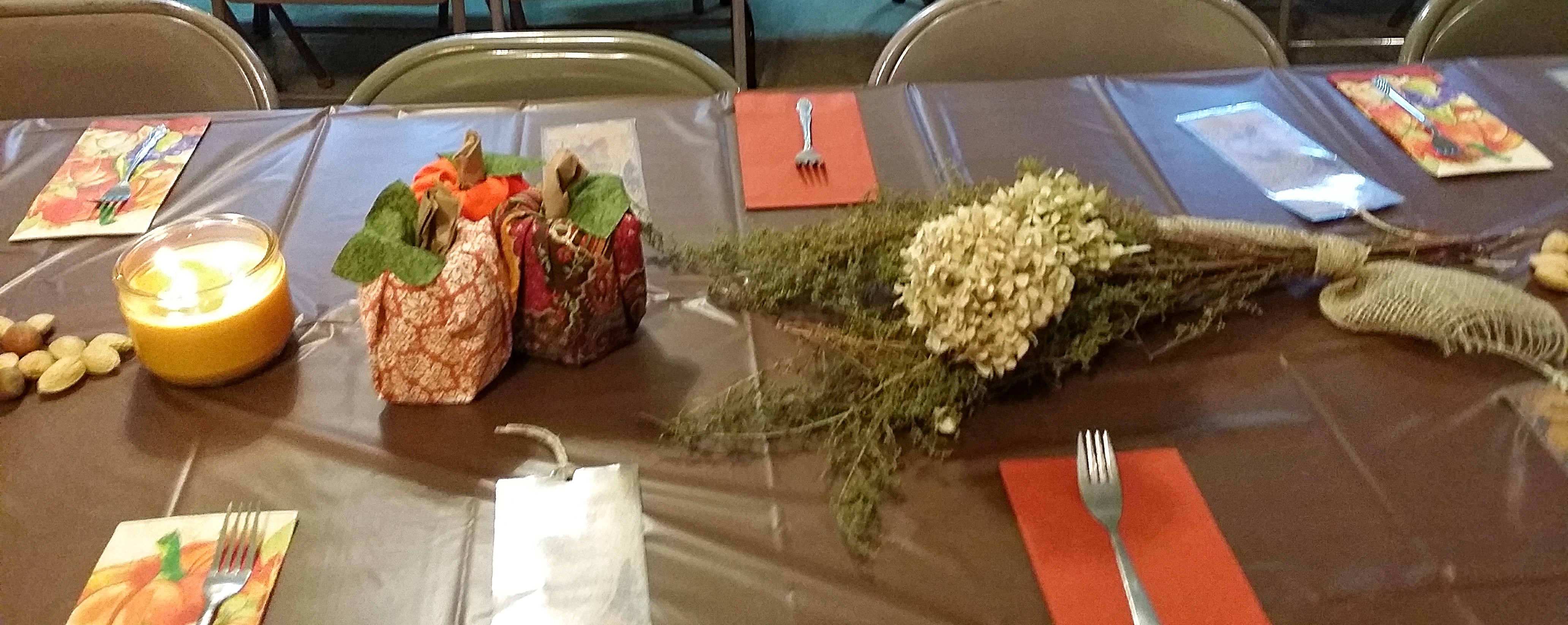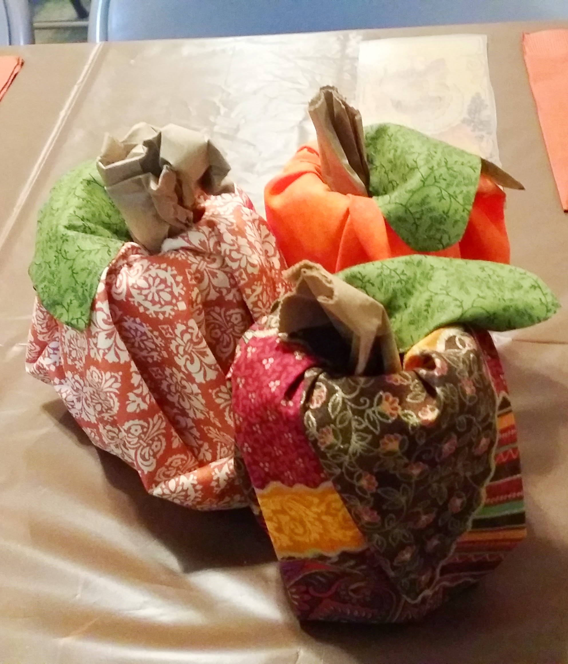 We had a Thanksgiving celebration at our church and it was wonderful. The children made some of the decorations. They were super cute and easy to make. These are nothing but a partial roll of toilet paper covered with material scraps with a brown paper bag twisted and tucked in the center for the pumpkin stalk. We cut out some green leaves and added them.