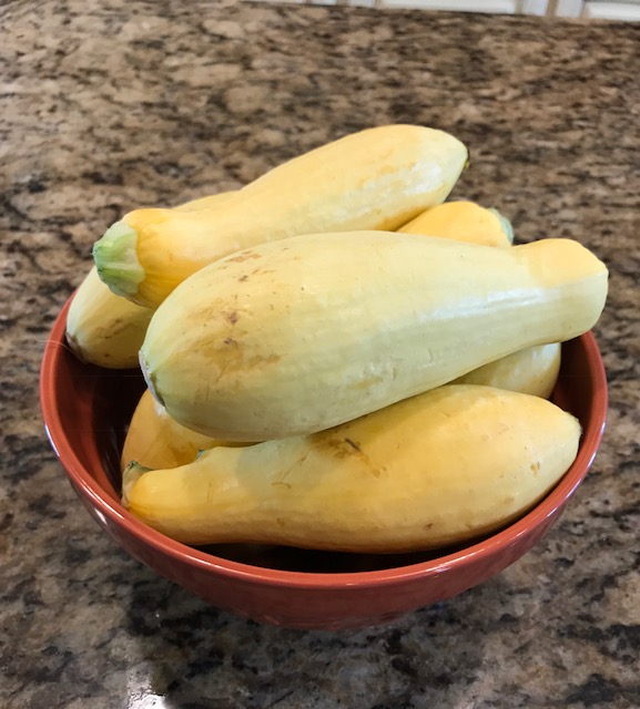 As you can see hers is the straight neck kind. It tastes just like the crooked neck but I think both varieties taste better when they are picked small to medium in size. These look large but they aren’t, the bowl is just small.