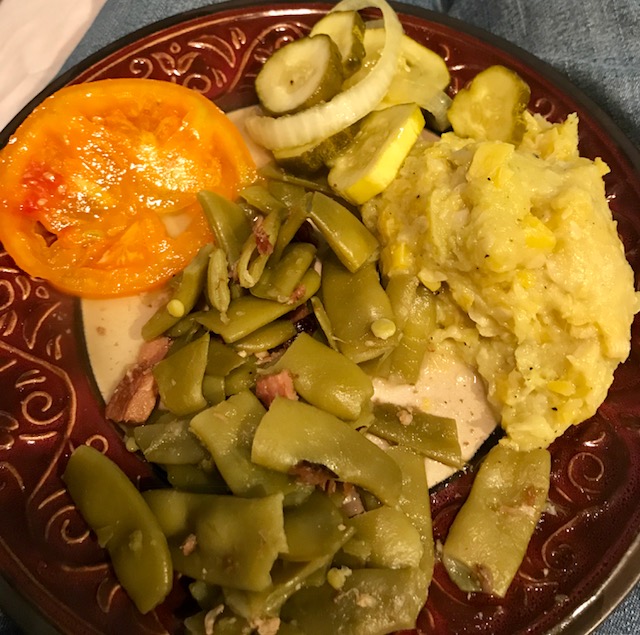 We do most things like our Mom’s did. My Mom never put sugar in green beans, my sister’s mother in law did. I cook a lot like my Mom but have made some healthier changes. As for the squash, until a few years ago the only way I would eat it was squash pickles. I tried cooking it and mashing it, looked like the doo-doo in a baby’s diaper and I couldn’t even try it. If you couldn’t tell, my Mom wasn’t a squash fan so we didn’t have it. I like both squash and zucchini cooked a different way. I wash, slice into thin slices, put in olive oil seasoned with Mrs. Dash, fresh ground black pepper, and kosher salt. Then I put the slices onto my little George Foreman grill and let cook a short time, I like it to still have a bite.