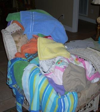 A couple of things I know are different about my crew and Moses’s bunch, I know we have more dirty laundry than they did.ย Considering their camping conditions I doubt if they got to bathe very often (ewww) Every time this crew goes to the beach they come back with dirty beach towels. So every night I throw them in the washer, dry them, and throw them in a chair. I started out folding them, got tired and decided “Hey, I’m on vacation, they can fold their own towels!”