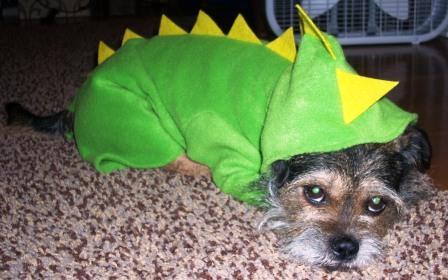 This is Elle the dinosaur (aka dog). Mom Ginny made her costume for her. Elle has requested dog biscuits instead of candy in her trick or treat bag.