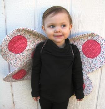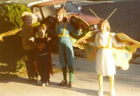 This cute butterfly is Martha. Martha’s mom, Char, said that the wings were made by Martha’s nana, Cheryl Booth, after Martha picked out the material. Nana also made Martha’s brother some blue wings but he was too busy playing to have his picture made.ย According to Char, “Life has come full circle, Iโm attaching a photo of me and my siblings from 1980.ย Itโs not the best picture, but my sister and I were butterfliesโฆ (Iโm the one in green, my sis in yellow) and my mom went ALL OUT with making those.ย I have such good memories of that Halloween โ the wings were HUGE and we loved, loved, loved them!ย They had batting and were quilted and we even had little finger loops, so we could spread the wings wide and FLY! ย I wish we still had those wingsโฆ