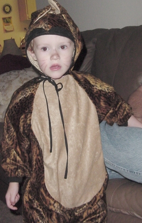 Char also says, “Iโm attaching some photos of Samuel when he was 2โฆ my mother-in-law (Faye Huskins) made this adorable costume for Samuel.ย He has a stuffed Tiger named Bob that is his most prized possession in all the world (and his best friend), so she made him a โBobโ costume.ย We still have it and Martha wears it now for fun.