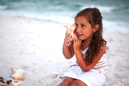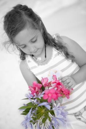 I love both shots. The black and white contrast with the colored flowers is amazing. I love how she is listening to the shell.
